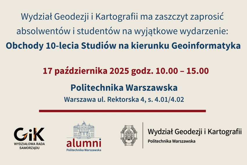 Serdecznie zapraszamy całą społeczność akademicką Wydziału GiK do wzięcia udziału w Obchodach 10-lecia Studiów na kierunku Geoinformatyka, które odbędą się 17 października 2025 roku, od godziny 10:00, w sali 4.01/4.02 w Gmachu Rektorska 4. W ramach wydarzenia, w godzinach 12:00 - 15:00, odbędzie się Debata pt. „Geodezyjne oko Wielkiego Brata. Powszechna inwigilacja czy fundament rozwoju Państwa i gospodarki?”, organizowana przez Biuro Karier PW, w ramach cyklu „Absolwenci w branży.